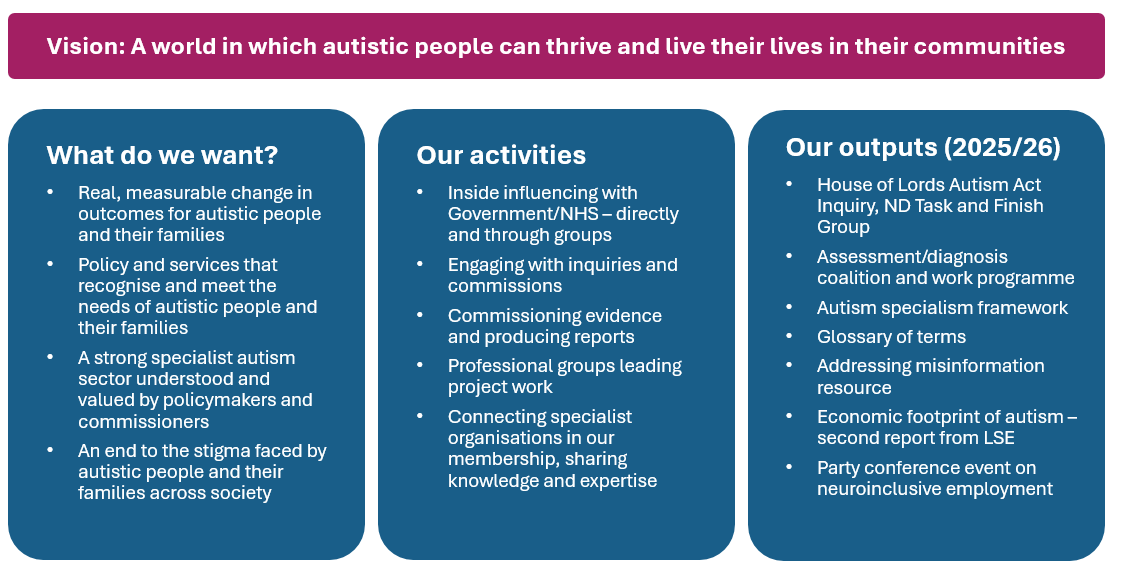 We work together to share our knowledge, skills and experience in ways which can improve outcomes and reduce inequalities for autistic people - and ultimately help us achieve our vision of a society where autistic people can thrive.